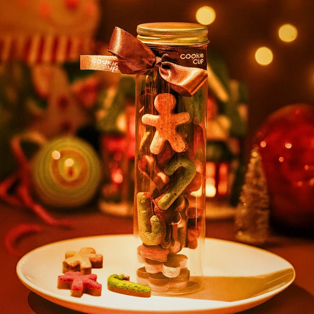 Biscoitos compostos com massa de cookie vermelho e verde e chocolate ao leite, em figuras natalinas de bengala e boneco de gengibre. Um sonho natalino de presente!